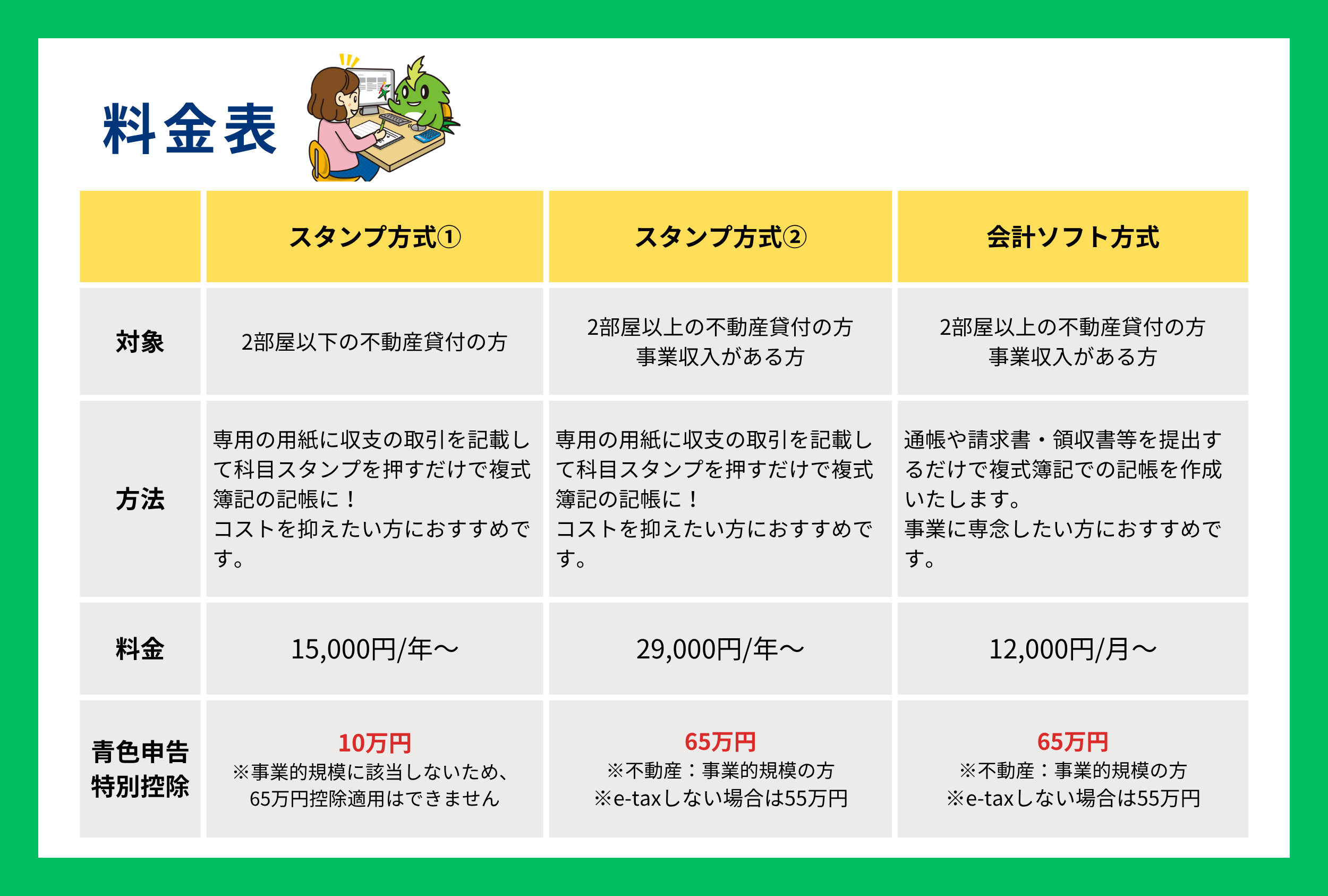 上記の金額には、紙代・帳簿印刷代及び帳簿の修正・決算仕訳入力・決算書作成代を含みます。